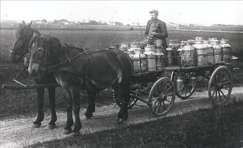 Kort tid efter kører vi ind på gårdspladsen, den store ruhårede hønsehund kommer gøende imod os. Den bliver helt flov og forsøger at svinge med den hale som den mangler, da den opdager det er os. Jens er lige netop ved at være færdig med, at spænde de to belgier for den store mælkevogn. Han skubber på den ene hest og sætter den sidste skagle på. Jens er ikke en mand af mange ord. Han kigger på os, og nikker, hvilket betyder, at vi kan sætte os op i vognen. Han trækker hestene rundt hestestalden hen til kostalden, hvor mælkespandene står. Vi springer ned og slår siden ned på vognen. Jens løfter de fyldte spande op i vognen og vi slæber dem på plads. Mælkespandene har et nummer der er prentet ind på hver enkelt spand. Da den sidste af de otte spande er på plads, sætter Jens sig op på kuskesædet. Mens vi kører ud af gårdspladsen finder Jens sin pibe frem, imens får jeg lov til, at holde tømmen. Det er egentlig ikke nødvendigt hestene kender turen og går i deres egen tempo. Da Jens har fået ild i piben tager han igen tømmen, han slår et par lette slag med tømmen henover ryggen på hestene, som derved sætter tempoet lidt op.